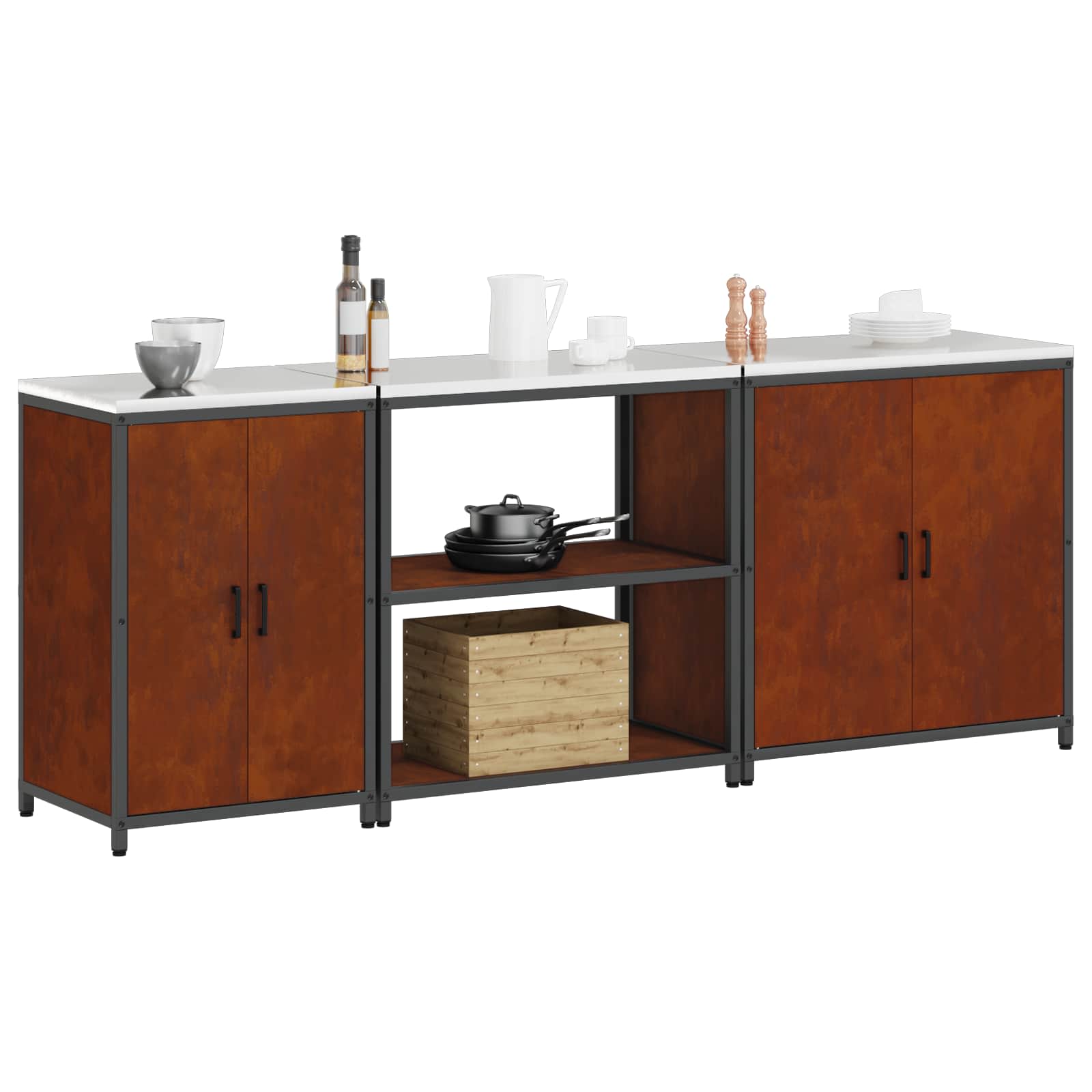 - Συμπεριλαμβανόμενα στοιχεία: Το ντουλάπι διαθέτει πολλαπλά ράφια και θήκες, σχεδιασμένα να καλύπτουν διάφορες ανάγκες αποθήκευσης, είτε πρόκειται για κατσαρόλες είτε για τρόφιμα. Με χάλκινα ράφια που προσφέρουν υποστήριξη για βαριά αντικείμενα, η κατασκευή του είναι κορυφαία. Επίσης, οι πόρτες είναι φτιαγμένες από μέταλλο για σφιχτό και ασφαλές κλείσιμο.