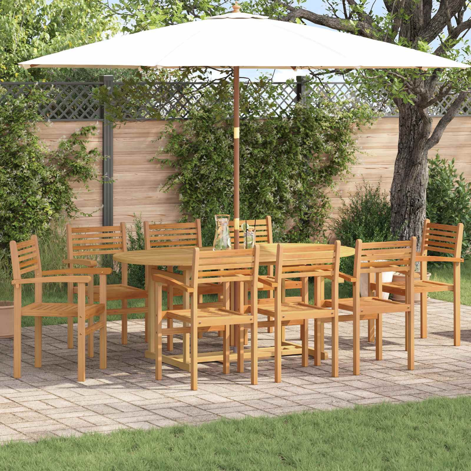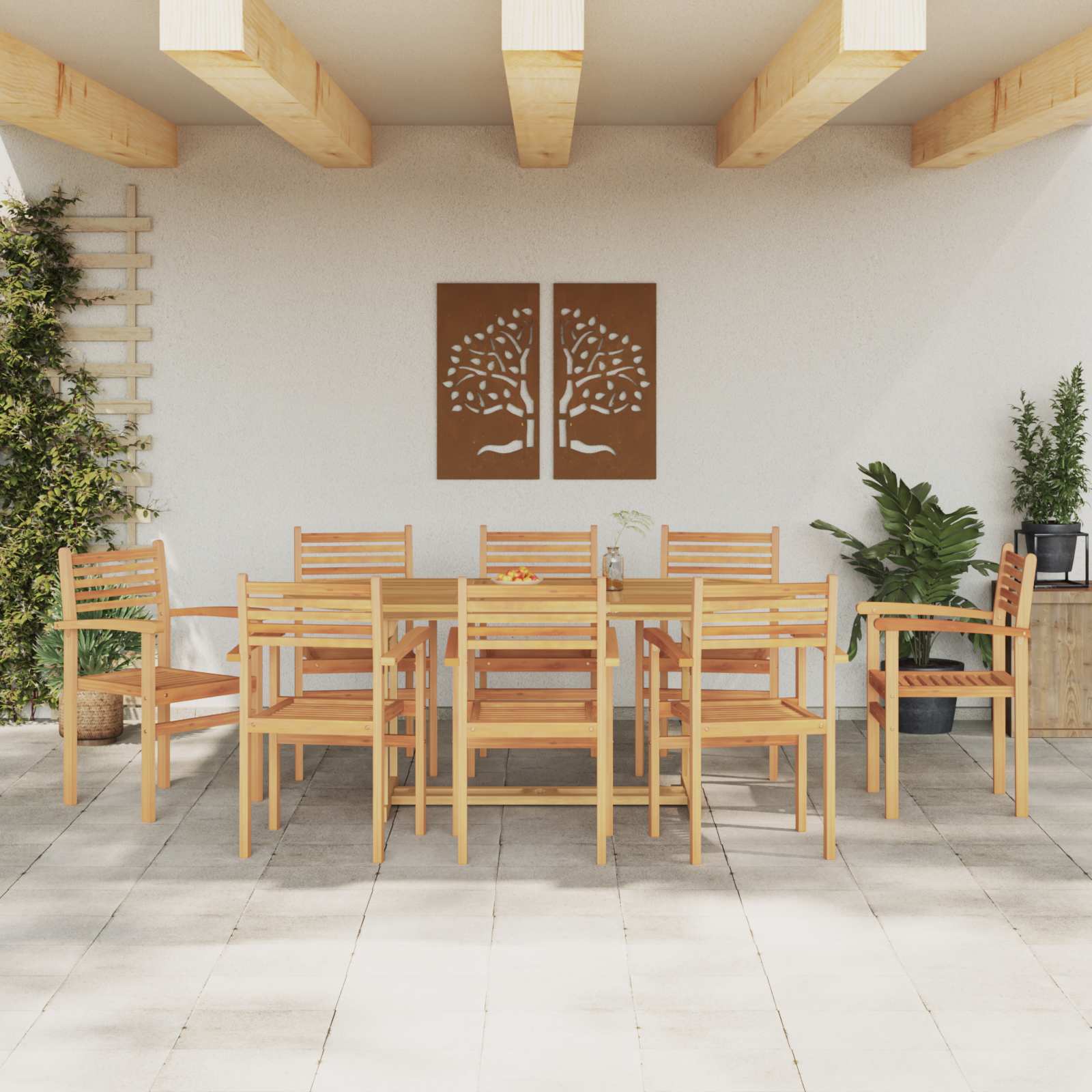 - Υλικά: Φτιαγμένο από premium μασίφ ξύλο teak, αυτό το σετ τραπεζαρίας κήπου συνδυάζει φυσική ομορφιά και ανθεκτικότητα. Το teak αντέχει στις καιρικές συνθήκες, κρατώντας τη γοητεία του καθ' όλη τη διάρκεια του χρόνου.