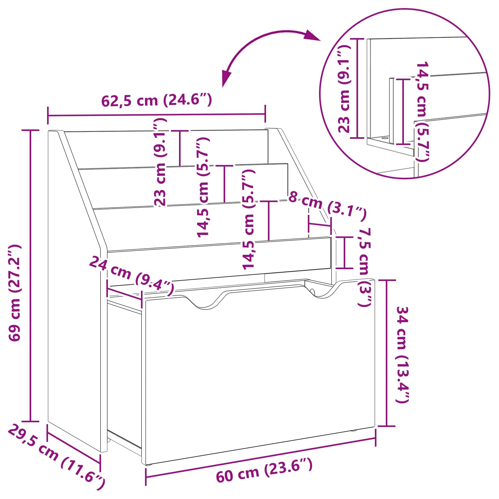 - Φιλικά προς τα Παιδιά Χαρακτηριστικά: Φτιαγμένη με τα μικρά στο μυαλό, η βιβλιοθήκη έχει ράφια που είναι εύκολα προσβάσιμα, προάγοντας την οργάνωση και την αυτονομία. Οι στρογγυλεμένες γωνίες και η σταθερή βάση μειώνουν τους κινδύνους, εξασφαλίζοντας ένα ασφαλές περιβάλλον για τα παιδιά σας.