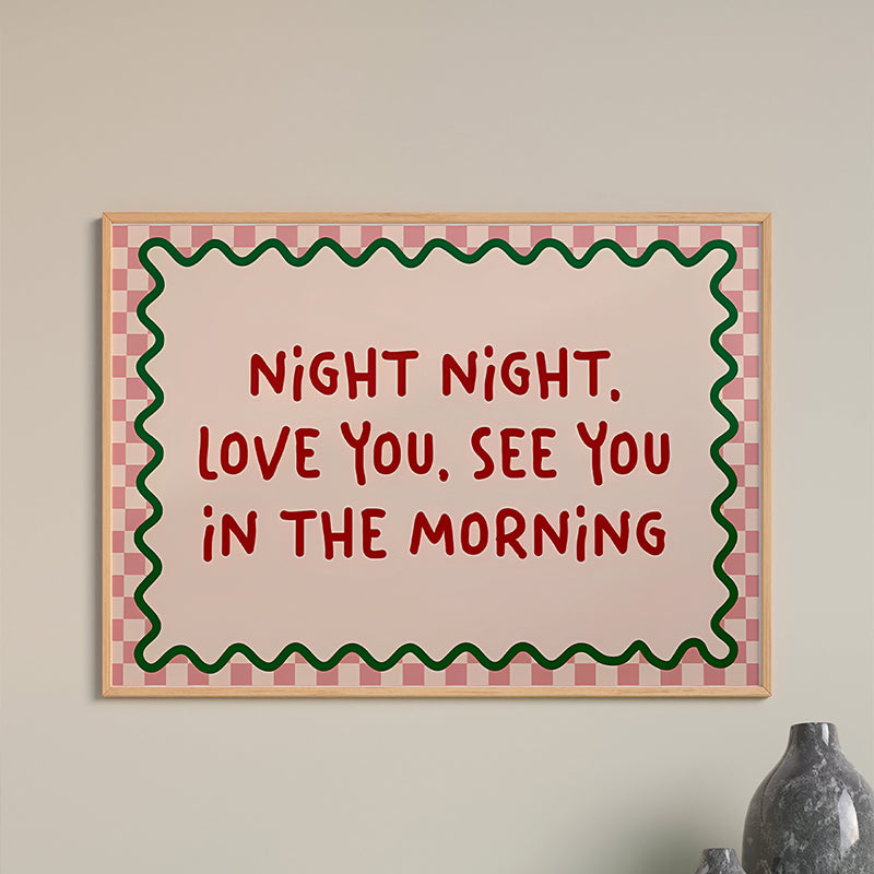 Ο πίνακας Tharis είναι ένα γλυκό και τρυφερό διακοσμητικό στοιχείο, ιδανικό για να κοσμήσει το υπνοδωμάτιο, το παιδικό δωμάτιο ή έναν χώρο χαλάρωσης. Η εκτύπωση διαθέτει μια γλυκιά καληνύχτα σε κόκκινα γράμματα, πλαισιωμένη από ένα παιχνιδιάρικο, κυματιστό περίγραμμα σε πράσινο και ροζ χρώμα.