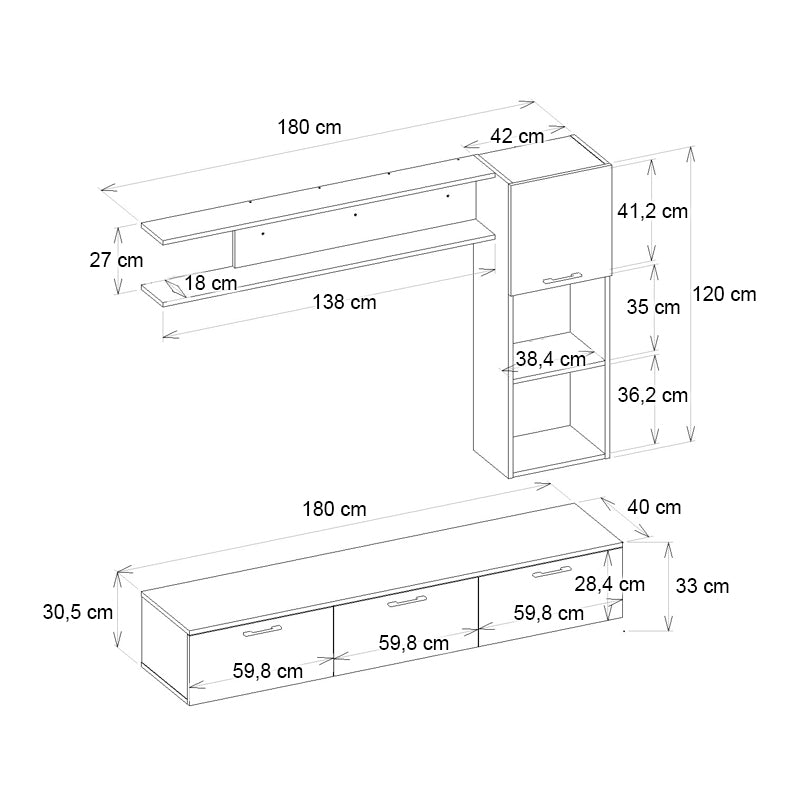 - Η σύνθεση διαθέτει δύο επιτοίχιες ραφιέρες, οι οποίες προσφέρουν χώρο αποθήκευσης και διακόσμησης.