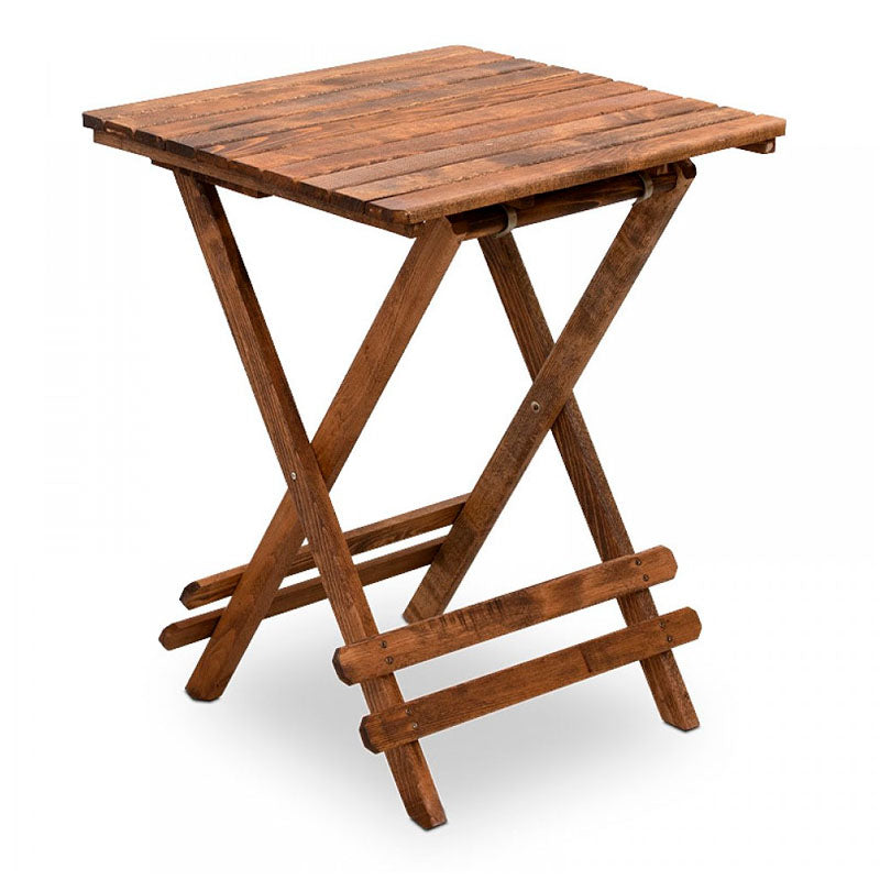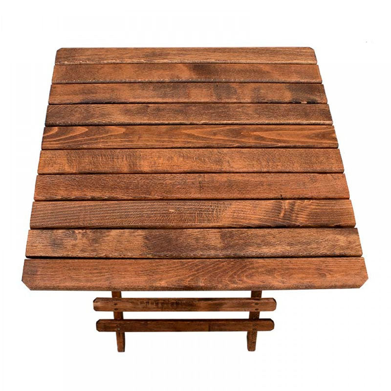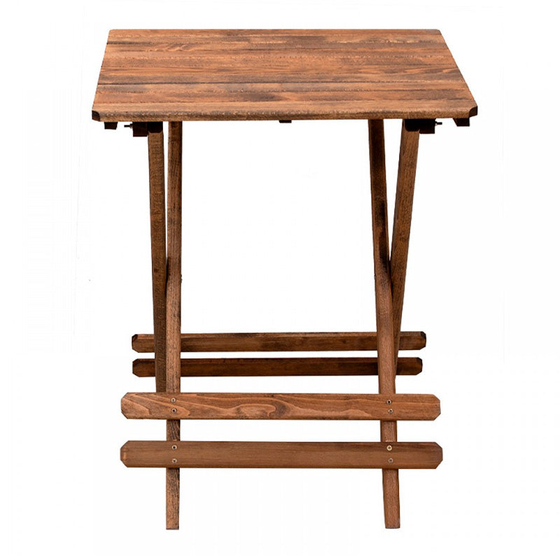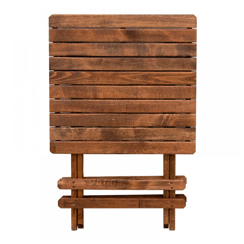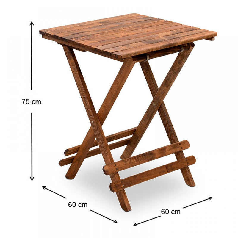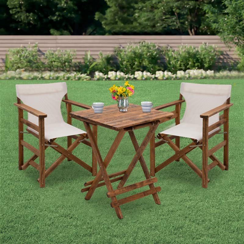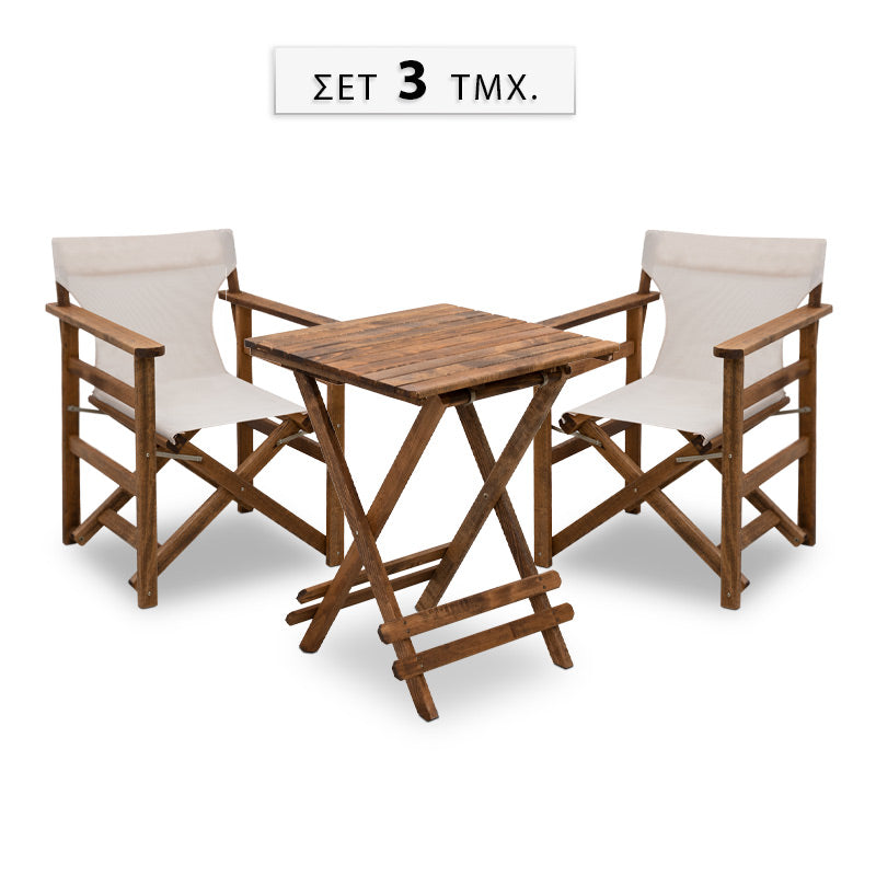 Το σετ περιλαμβάνει ένα τραπέζι με ενισχυμένο σκελετό από μασίφ ξύλο φουρνιστής οξιάς και δύο πολυθρόνες σκηνοθέτη σε καρυδί χρώμα με διάτρητο εκρού πανί.
