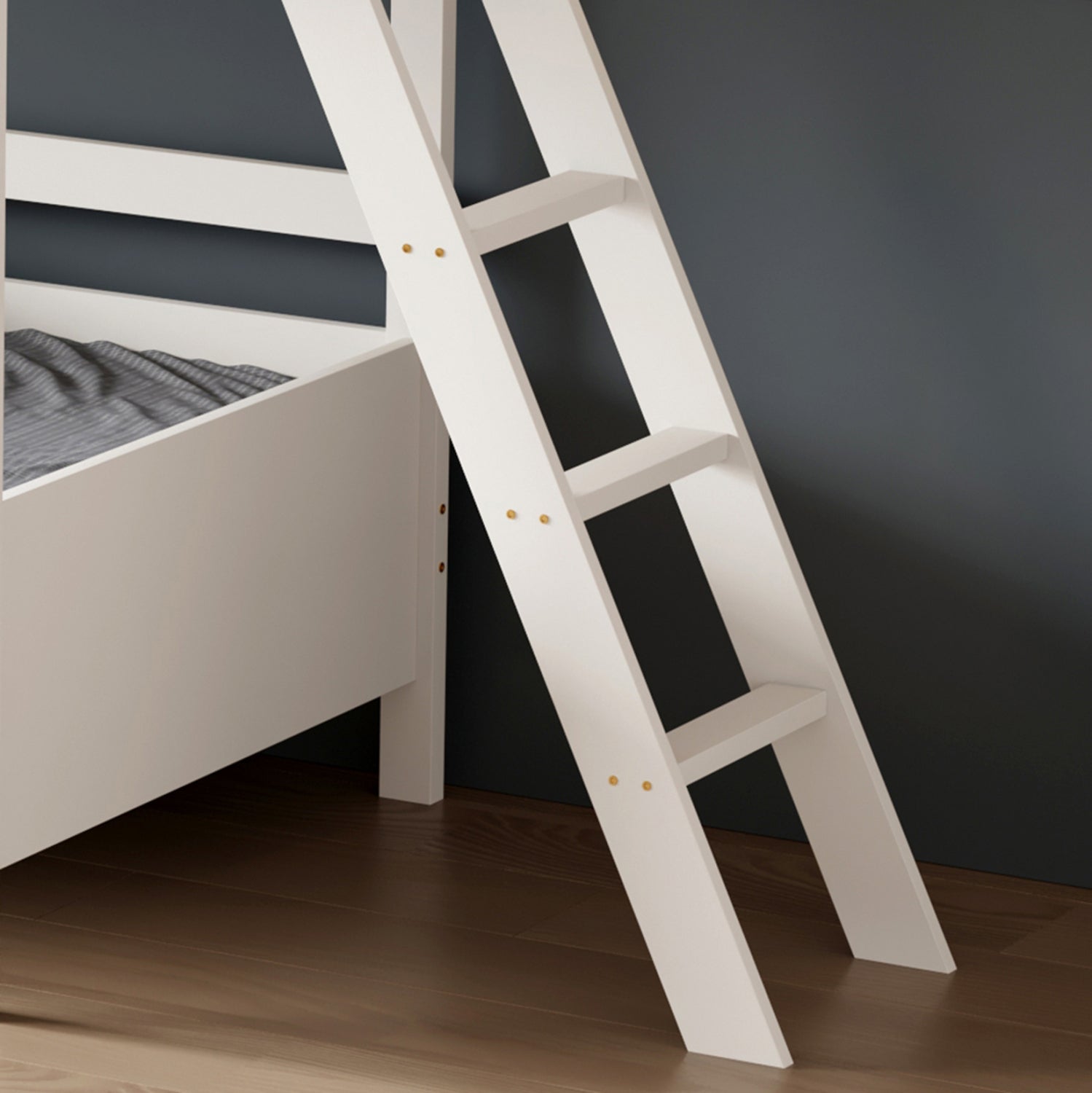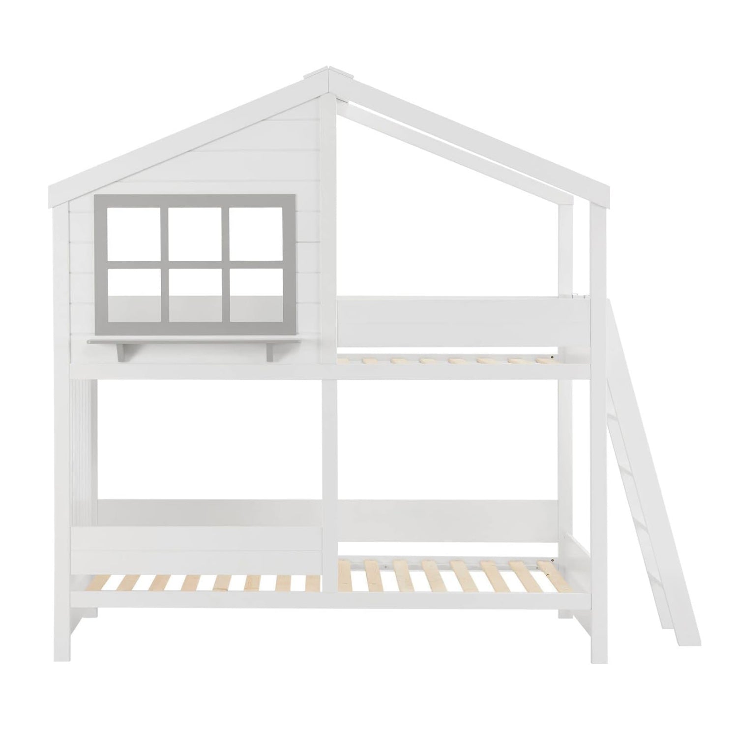 Η παιδική κουκέτα COMBO σε διάσταση για στρώματα 90x190εκ, είναι κατασκευασμένη από ξύλο πεύκου σε ΛΕΥΚΟ χρώμα. Η κουκέτα που έχει σχήμα σπιτιού με παράθυρο διαθέτει περιμετρικά κάγκελα και πλαϊνή σκάλα πρόσβασης στο επάνω κρεβάτι, ενώ τα στρώματα τοποθετούνται σε τάβλες από κόντρα-πλακέ ξυλεία.